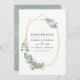 Invitación de boda con marco geométrico dorado y acuarela plateada de salvia para foto de boda con eucalipto verde, personalizable según los detalles de su evento. Ideal para cualquier tema o boda de jardín.