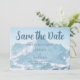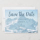 Esta hermosa tarjeta de guardar la fecha de la montaña presenta una poderosa fotografía de montañas con nieve en invierno. Agregue los detalles de su evento en escritura azul sobre las colinas nevadas. Fotografía perfecta para una boda de clima frío en un resort de esquí.