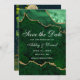 Tarjeta de aviso de boda moderna y elegante con geoda de ágata de mármol verde esmeralda y dorado en acuarela - Foto en la parte posterior
