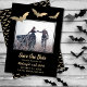 Los hermosos murciélagos de Relieve metalizado hacen que esta tarjeta Save the Date destaque. El fondo es negro, con un patrón de murciélago dorado a juego. Perfecto para un gótico o un boda de Halloween. Vea la coordinación de artículos en nuestra tienda, Enchanted Finch.