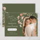 Guardar la fecha de boda elegante boho con flores silvestres con foto y fondo verde oscuro. Suaves flores silvestres de acuarela en tonos melocotón y beige y foto de la pareja. Estas flores silvestres de acuarela en tonos melocotón sobre un fondo verde oscuro son perfectas para bodas caprichosas con flores silvestres.