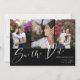 Doble cara guardar la tarjeta de fecha con tres fotos en un collage limpio en un lado y una foto más grande en el otro. Save the Date se escribe en un estilo de caligrafía más suelto en blanco sobre negro. Agregue sus nombres e información de boda. En la parte posterior, también puede agregar su sitio web boda.