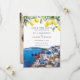 Esta elegante invitación de boda para guardar la fecha con limones pintados con acuarela y escena de Santorini Grecia se puede personalizar con su información en tipografía chic y toda su foto especial en el reverso. Diseñado por Thisisnotme©