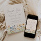 Este diseño boho rústico presenta una frontera de acuarela de flores silvestres naranja y azul a lo largo de la parte inferior. Las palabras "Guardar la fecha" y los nombres de la pareja aparecen en elegante letra manuscrita gris carbón, con el texto restante en fuente sans serif sobre un fondo rosa rubor.