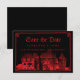 Impresiona a tus invitados con este aviso de guardar la fecha de la boda gótica. Esta tarjeta clásica presenta una inquietante ilustración vintage de un castillo, que puedes reemplazar con una imagen del destino donde te casarás (se prefiere fondo transparente). Una tipografía blackletter caligráfica muestra los nombres de la novia y el novio, la fecha y la ubicación. Un borde dibujado a mano encierra el diseño. La paleta de colores es rojo sangre sobre negro.