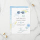 Boda de playa irregular salva la tarjeta de fecha con gafas de sol, chanclas, corbata de arco, marisco a la deriva, estrella de mar y conchas mezcladas con flores azul y amarillo pastel.