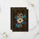 Composición de reloj de vapor redondo con dial numérico romano negro, decorado con arcos de oro y latón, mariposas morfo azules y lentes dañadas sobre fondo rayado marrón. Estilo Steampunk.