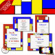 Una divertida y divertida invitación a una boda retro que es tan divertido como lo eres - un vistazo nostálgico a la mitad de los años sesenta con un tipo de letra genial y atrevida, emparejado con colores primarios de amarillo, azul y rojo delineado en negro en formas geométricas en el estilo de Mondrian.