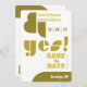 Alegre, creativa, divertida, un poco divertida y definitivamente una declaración, esta moderna tipografía geométrica ahorra la tarjeta de fecha le dice a todos tus amigos y familia que dijiste "¡sí!" Esta versión tiene un fondo blanco con acentos aguacate y verde oliva y mostaza. Las esquinas redondeadas de la tarjeta complementan las formas geométricas de la tarjeta. Se muestra en el material de cartón blanco normal, pero la opción de papel blanco Felt añadirá al ambiente retro. Delante: Una ampersand geométrica, nombres de pareja, la fecha, "¡sí!" en un tipo de letra geométrica genial, "Salva la fecha", y la ciudad y el estado. Fondo blanco con formas geométricas coordinadas, espacio para un mensaje adicional y un código QR para el sitio web de su boda. Parte de nuestra colección Bushwick con nuestro tema de color ginkgo. Invitaciones de coordinación y accesorios de correo disponibles.