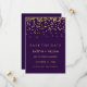 Estas elegantes invitaciones para salvar la fecha tienen un fondo morado oscuro rico y un aspecto moderno de confeti dorado.
