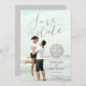 Escritura a mano de glamour con efecto fotográfico impreso en Relieve metalizado plateado | Foto Guardar la tarjeta de fecha. Elke Clarke© Disponible en www.zazzle.com/monogramgallery. Diseño minimalista moderno de superposición de fotos con las palabras "Save the Date" en escritura a mano de plata. Un punto plateado para la fecha del boda y texto gris plateado para los nombres de novias y novios y texto de información de invitación boda. Relieve metalizado plateado es un efecto fotográfico impreso. Otros colores disponibles en o tienda.