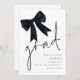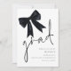 Grad de graduación Black Bow Save the Date. Disponible digitalmente e impreso. Este diseño tiene un arco de coqueta negra en la parte superior izquierda y un guión de estilo de escritura de conjunto informal para el encabezado principal, el grado y la tipografía fácil de personalizar en el lado inferior derecho con sus detalles.