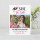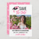 La graduación con un toque de color con el tema de la proa, salva la tarjeta de fecha con una foto del graduado y guarda la fecha escrita en una combinación de letras negras y modernas y un guión de pincel rosa brillante, con un pequeño gorrito negro de graduación adornado con una gran proa rosa. La graduación rosa ahorra la tarjeta de plantilla de fecha personalizada con una foto de tu hija graduada, con un lindo tema de arco. Pídele a tus amigos y familiares que guarden la fecha de tu graduado con este graduado plano que ahorre la tarjeta de fecha en un estilo de niñita con el color rosa como acento.