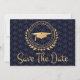 Me gusta diseñar obras de arte para las graduaciones. Es un estilo Art Déco maravilloso y único, con elegantes colores dorados, negros y azules. Guarda la tarjeta de anuncio de fecha. Texto de estilo moderno. Añade tu propio mensaje en la parte posterior de las tarjetas dándole detalles a tu familia y amigos para guardar la fecha de una ceremonia de graduación, evento, fiesta u otra ocasión. El diseño de estilo de logotipo incluye hojas de laurel, estrellas y un tapón de graduación. Felicitaciones al graduado.