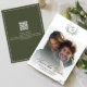 Haga una impresión atemporal con esta elegante y ahorrada fecha, presentando una impresionante plantilla de fotos boda enmarcada por un motivo de monograma clásico. El rico diseño floral verde oscuro y la elegante vegetación floral romántica crean una estética sofisticada, complementada por un guión de caligrafía minimalista. Resalte su monograma de novia y novio en una plantilla de foto simple que exuda el estilo formal tradicional con un suave toque simplista. Perfecto para anunciar su día especial con elegancia.