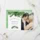 Tarjetas de foto de ahorro de fecha de boda con hojas de agua tropicales de color verde salvia y magnolias blancas de acuarela.
