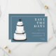 Una boda Save the Date que incluye un ilustracion de los dos novios en un pastel de boda de corbata de arco. La tarjeta tiene un esquema de color azul y blanco. Simplemente agregue sus nombres e información, añada esta opción Guardar la fecha a su carrito y tenga un boda maravilloso. Grooms Boda Cake Blue LGBTQ Guardar diseño de vacaciones | ©Melissa Patton - Diseñador