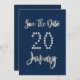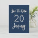 Guardar la fecha Fiesta de enero Navy Blue Silver Script Elegant Guardar la tarjeta de fechas para la fiesta de boda, Fiesta del aniversario o su evento de enero.