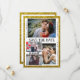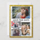 Comparte tu fecha de boda con tus amigos y familiares y hazles guardar la fecha!! Este diseño tiene un collage de 4 fotos, guardar el texto de la fecha en el medio, los textos elegantes de nombre y la fecha y ubicación del boda. El diseño tiene un contorno de purpurina dorado.