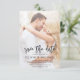 Transparencia que cubre la foto personalizada y personalizada en la parte delantera y trasera de elegantes y modernas invitaciones de boda para guardar la fecha, incluye una tipografía de guión hermosa y elegante para la celebración especial del día de la boda.