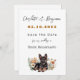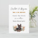 La boda guarda las invitaciones de fecha con el diseño de perro pastor alemán. El cachorro yace entre flores silvestres en el diseño al final del papel blanco. El texto negro se utiliza en secuencias de comandos y fuentes impresas, excepto para la fecha que es naranja de óxido.