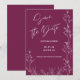 Presentamos nuestra tarjeta de Guardar la fecha de boda minimalista y trendy, que presenta un color Morado Pensamiento adornado con un diseño floral simple pero elegante. La delicada caligrafía blanca añade un toque de sofisticación a esta tarjeta de Guardar la fecha Morado Pensamiento, lo que la convierte en una opción ideal para una celebración de boda moderna.