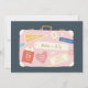 Una tarjeta de guardar la fecha de destino con personalizaciones de texto divertidas e ilustraciones de un equipaje rosa.
