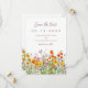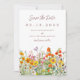 Estas hermosas tarjetas de Guardar la fecha presentan un prado lleno de flores silvestres en tonos de rosa, púrpura, naranja y amarillo.