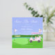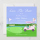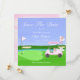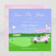 Este save the date de despedida de soltera con tema de golf está diseñado con la futura novia en el corazón de su diseño. Cuenta con un green de putting en forma de corazón y un pin de bandera ondeando en la brisa, con las palabras "Futura Novia" grabadas. El carrito de golf está adornado festivamente con champán, regalos, una tiara y una torta de despedida de soltera ilustrada de manera intrincada. Un velo de novia se drapea elegantemente desde la bolsa de golf, agregando un toque encantador. Diseñado por Daphsam, este save the date único viene con una plantilla fácil de usar para asegurar una planificación sin estrés.