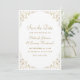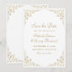 Esta elegante tarjeta de guardar la fecha de boda formal vintage inspira el texto en fuentes de guión y serif de color dorado, enmarcado por un delicado motivo de vid dorada vintage. El marco se repite en el reverso.