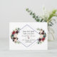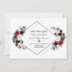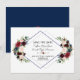 Tarjeta de diseño elegante con hermosos ramos de flores de acuarela burgundy, merlot y azul marino, una forma de diamante doble, sobre blanco y en el reverso las mismas flores sobre un fondo azul marino. Podría ser una excelente opción para cualquier boda de temporada, especialmente para bodas de otoño e invierno. Utilice la herramienta Personalizar para agregar su información y realizar cambios. Para artículos coincidentes, visite mi Colección Floral Geométrica Merlot Azul Marino.