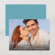 Anuncia que estás comprometida con mis modernas invitaciones de "Save the Date" que presentan "Save Our Date" en un estilo de tipografía de letra script trendy que evoca la apariencia de letras a mano. Diseñada para acomodar tu foto favorita de pareja en orientación horizontal o apaisada con sangrado completo, esta tarjeta simple presenta un texto superpuesto en azul turquesa con sus nombres, fecha de la boda y ubicación de la boda. Las tarjetas se revierten a un color azul turquesa sólido complementario. Para ver el conjunto de bodas a juego, visite DoTellABelle en Zazzle.