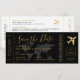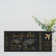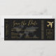 Tarjeta de invitación de pasaje de avión de tarjeta de embarque "Save the Date" en gallina y elegante negro y dorado para una boda de destino moderna con un logotipo de avión romántico y fondo de mapa mundial y espacio en la parte posterior para información de viaje y alojamiento para que los invitados comiencen a planificar su viaje para celebrar su matrimonio en medio de unas vacaciones.