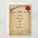 La era de la caballería y el romance: pergamino de imitación medieval pergamino rojo sellador de lana salva la tarjeta de Invitación Boda de fecha. Esta carta, elaborada con exquisita atención a los detalles, refleja la esencia de una época pasada, con un rico pergamino (falso) de época adornado con acentos negros y un auténtico sello de cera roja y una caligrafía elegante.