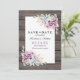 Tarjetas de guardar la fecha con estilo country chic que presentan un fondo de granero de madera rústica, una exhibición de suculentas en la esquina y una plantilla de texto personalizada de guardar nuestra fecha.