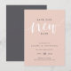 ¿Necesitas posponer o reprogramar tu boda? Hazlo saber a tus invitados con estas elegantes tarjetas en rosa blush chic, gris suave y blanco crujiente. El diseño presenta "guardar nuestra nueva fecha" en la parte superior con la nueva fecha de la boda y el sitio web de la boda debajo.