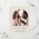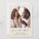 Esta sencilla y minimalista tarjeta Save the Date incluye un arco fotográfico sobre las palabras "Save the Date" en un elegante guión de escritura a mano en negro, seguido por los nombres de la pareja, la fecha boda y la ciudad en letra sans serif en un fondo beige. Añada un mensaje más detallado con información adicional sobre la marcha atrás.