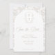 Boda de Escudo en Monograma Pale Taupe Guardar la fecha: escudo de monograma de arte de línea inspirado en la época de la cosecha con elegante tipografía de taupe pálido. Presenta un patrón floral chinoiserie en forma de arco y al revés para una sofisticación atemporal. Tipo de letra elegante para un estilo formal y clásico.