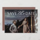 Una tarjeta de fecha moderna para guardar la tarjeta diseñada para acomodar tu foto de compromiso horizontal o horizontal favorita orientada a todo el paisaje. "Guardar la fecha" aparece en la parte superior de la foto en bloques blancos y letras de guiones, con sus nombres, fecha de boda y ubicación de boda debajo. Las tarjetas se invierten para mostrar detalles adicionales de la fecha.