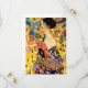 Tarjeta con la pintura al óleo de Gustav Klimt Lady with Fan (1918). Una mujer con un kimono azul sostiene un ventilador rojo contra un colorido fondo amarillo de flores y pavos reales. Un gran regalo para los amantes del arte japonés y europeo.