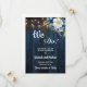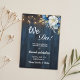 Una elegante tarjeta Save the Date con una caligrafía elegante completada por una maravillosa madera azul, luces de cuerda de jardín y floral azul blanco con purpurina dorado. Puede personalizar esta tarjeta con sus detalles previos al Boda.