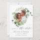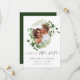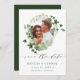 Elegante geométrico botánico guardar las fechas presenta una foto de compromiso favorita rodeada por una corona geométrica dorada de ramas vibrantes de hojas de hiedra y bayas de nieve, "guardar la fecha" en letras de caligrafía, con sus nombres, fecha de boda y ubicación debajo de tipo clásico serif gris. Tonos vivos de follaje verde, sabores suaves y formas geométricas de gris y oro para este conjunto de colores fresco y armonioso. El reverso presenta un fondo verde forestal rico y coordinado. *** Para la solicitud del personalizado, por favor escriba un correo electrónico a citronelladesign@gmail.com.