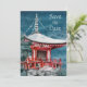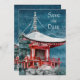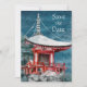 La invitación Save the Date de esta boda captura la belleza oriental de Japón. Tiene un bonito fondo azul con un templo budista japonés pintado y vegetación.