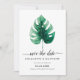 Diseño moderno de tarjeta de aviso de boda con ilustración de hoja de monstera verde en acuarela sobre un fondo blanco simple. El reverso