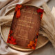 Un diseño acogedor y elegante que presenta un fondo de madera natural rodeado de ricas hojas de otoño y cálidos acentos estacionales. La composición combina texturas rústicas con tipografía dorada, creando una estética encantadora e invitante. Ideal para anunciar un día especial con una atmósfera natural, atemporal y cálida inspirada en el otoño.
