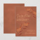 Estas elegantes tarjetas de aviso de boda presentan un diseño rústico y moderno con ramitas de hojas de acuarela pintadas a mano de color óxido o marrón quemado que entran por ambos lados de la tarjeta sobre un fondo de terracota veteado. La tipografía es única y elegante con texto justificado a izquierda y derecha. Simples y elegantes, estas tarjetas son la forma perfecta de informar a amigos y familiares sobre tu próxima boda.