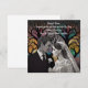 Pareja de novios hecha de papel puesta sobre un fondo de árboles de muchos colores.