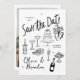 Set the tone for a joyful celebration with this whimsical, hand-drawn Save the Date card! Featuring charming black-and-white sketches of wedding icons — cake, champagne, flowers, and more — this playful design blends casual charm with artistic flair.