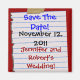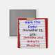 "¡Salva la fecha!" en azul en negrita con la fecha en texto negro en una nota escrita en una hoja de papel pegada a un fondo rojo. El texto de ejemplo dice: "¡Jennifer y el Boda de Robert!" en rojo. Cambia fácilmente los colores del texto a tu gusto. Además, basta con hacer clic en "Personalizar" y luego "editar" y luego "fondo" para cambiar el fondo rojo. Un imán divertido que seguramente será el recordatorio perfecto para cualquiera. ¡Fácil de personalizar del texto en sus propias palabras y ese día especial para no ser olvidado! Ideal para los próximos bodas, cumpleaños, aniversarios, duchas, reuniones, cualquier ocasión especial y salvar la fecha. ¡No te olvides de guardar esa fecha!