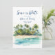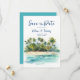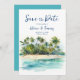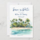Infórmele a sus huéspedes para que marquen sus calendarios para su boda de destino de ensueño con esta playa tropical de Paradise Island, salven la invitación de cita. Las obras de arte originales, con colores verde y turquesa exuberante, encierran las encantadoras vibraciones de una playa tranquila y pintan una imagen de palmeras balanceadas y playas con besos de sol, lo que da el tono ideal para su boda. El reverso presenta un elegante monograma de silueta de palmera con iniciales de nombre que pueden personalizarse. Arte por KL Stock